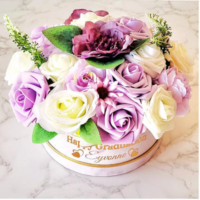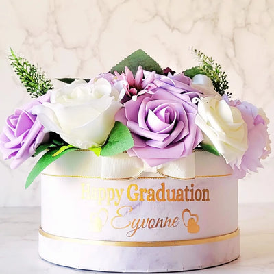 Nestled within a charming Marble White and gold hat box lies a blooming treasure – the Personalised Name Happy Graduation Purple, Pink and White Flower Hat Box. This captivating Graduation Gift Box is a delightful Floral Arrangement that serves as a customised Graduation Keepsake, perfect for a surprising and delightful Gift For Her. Carefully curated, the hat box exudes elegance with its purple and pink rose centrepiece, exquisitely arranged to enchant any recipient. Imagine the joy on her face as she opens this exquisite gift, a beautiful reminder of your thoughtfulness. Elevate the art of gifting with this stunning Personalised Artificial Purple Rose Flower Hat Box, a true celebration of beauty and affection.🌸✨